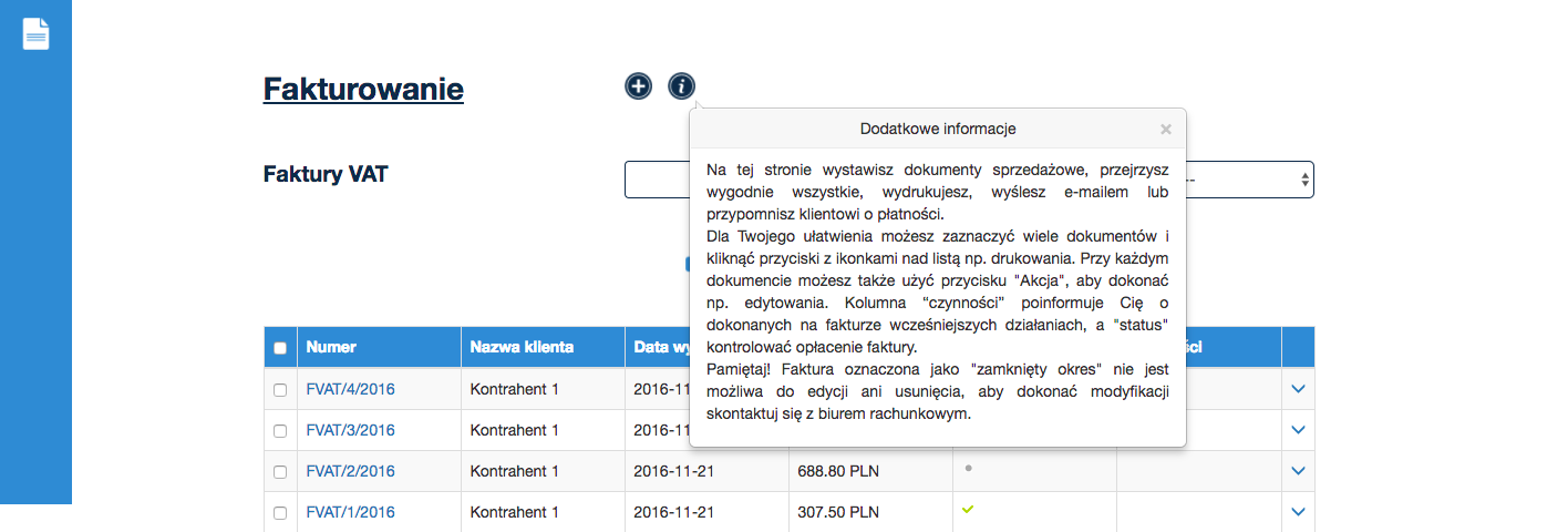 Możesz także wybrać opcję przejścia do pełnej części modułu klikając w ikonę "fakturowania" w menu znajdującym się po lewej stronie, który zawiera: zarządzanie fakturami, możliwość tworzenia zdefiniowanych faktur, a także tworzenie słowników klientów i produktów.