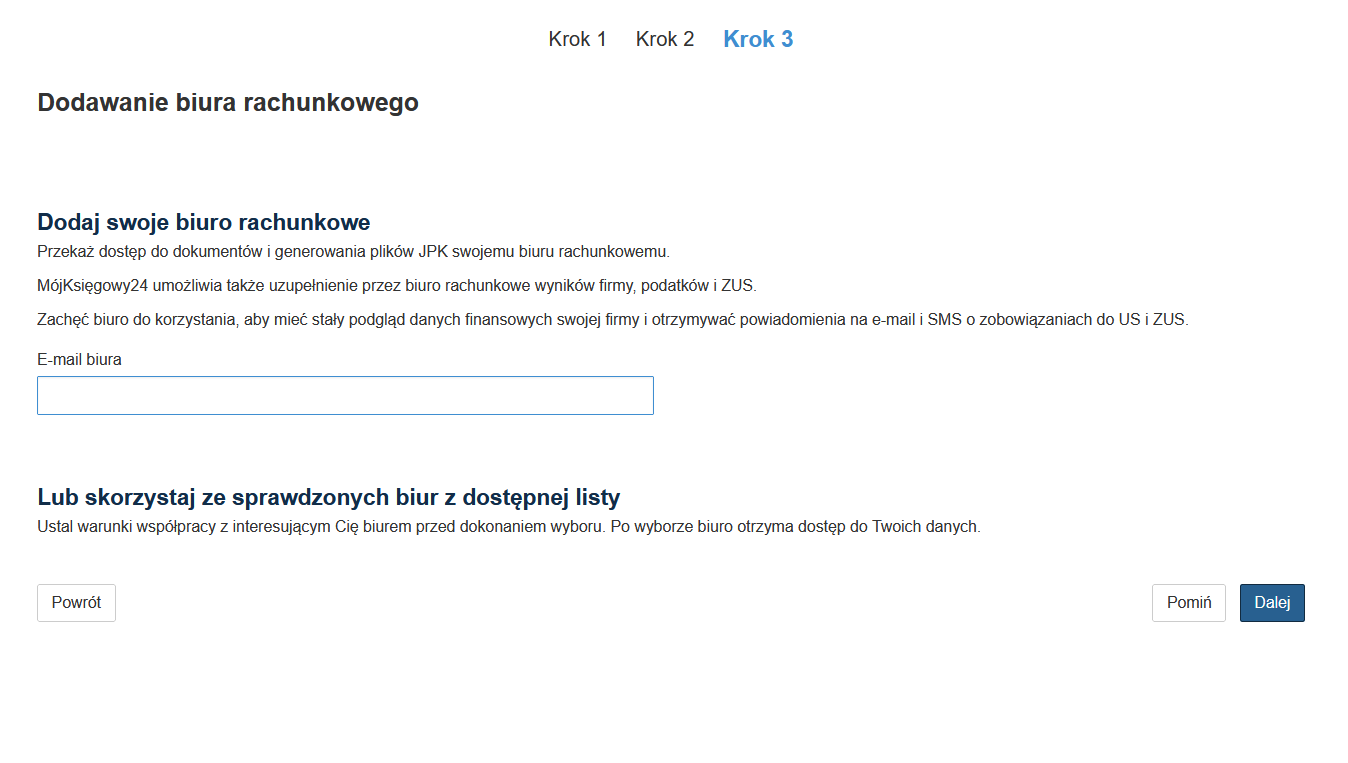 W celu korzystania z aplikacji mójksięgowy24.pl należy założyć konto. Należy kliknąć opcję na stronie Wypróbuj za darmo. Następnie należy zdecydować czy konto należy do firmy czy biura rachunkowego, Wiąże się to z dostępnością różnych pakietów w zależności od profilu działalności. Podaj adres e-mail służący później do logowania, hasło oraz zaakceptuj regulamin. Na tym etapie konieczne będzie także zdecydowanie, z którego pakietu chcemy korzystać Fakturowanie bądź Fakturowanie plus Książka przychodów i rozchodów. Po kliknięciu przycisku zarejestruj zostaniesz przeniesiony do aplikacji. W celu korzystania z aplikacji należy wypełnić niezbędne dane. Służy do tego kreator, który pojawi się na górze strony, pierwszy krok to poniższy formularz, aby uprościć dodawanie danych wystarczy wpisać numer NIP w pierwsze pole, dane zostaną uzupełnione z GUS. Podaj adres e-mail firmowy, do korespondencji możesz podać inny w kolejnych krokach.