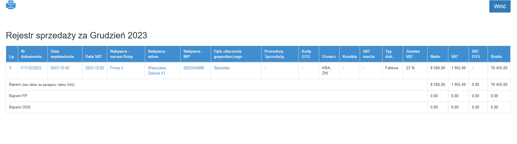 W rejestrze znajdują się dokumenty sprzedaży, które zostały wprowadzone z Fakturowania. Zawiera dane według kolumn wraz z podsumowaniem, z wyszczególnieniem sprzedaży VAT OSS oraz sprzedaż na podstawie faktur do paragonu. Rejestr można wydrukować.