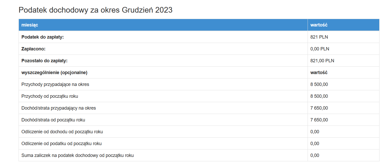 Po kliknięciu w poszczególny miesiąc pojawią się wszystkie szczegółowe informacje dotyczące podatku dochodowego tego okresu.