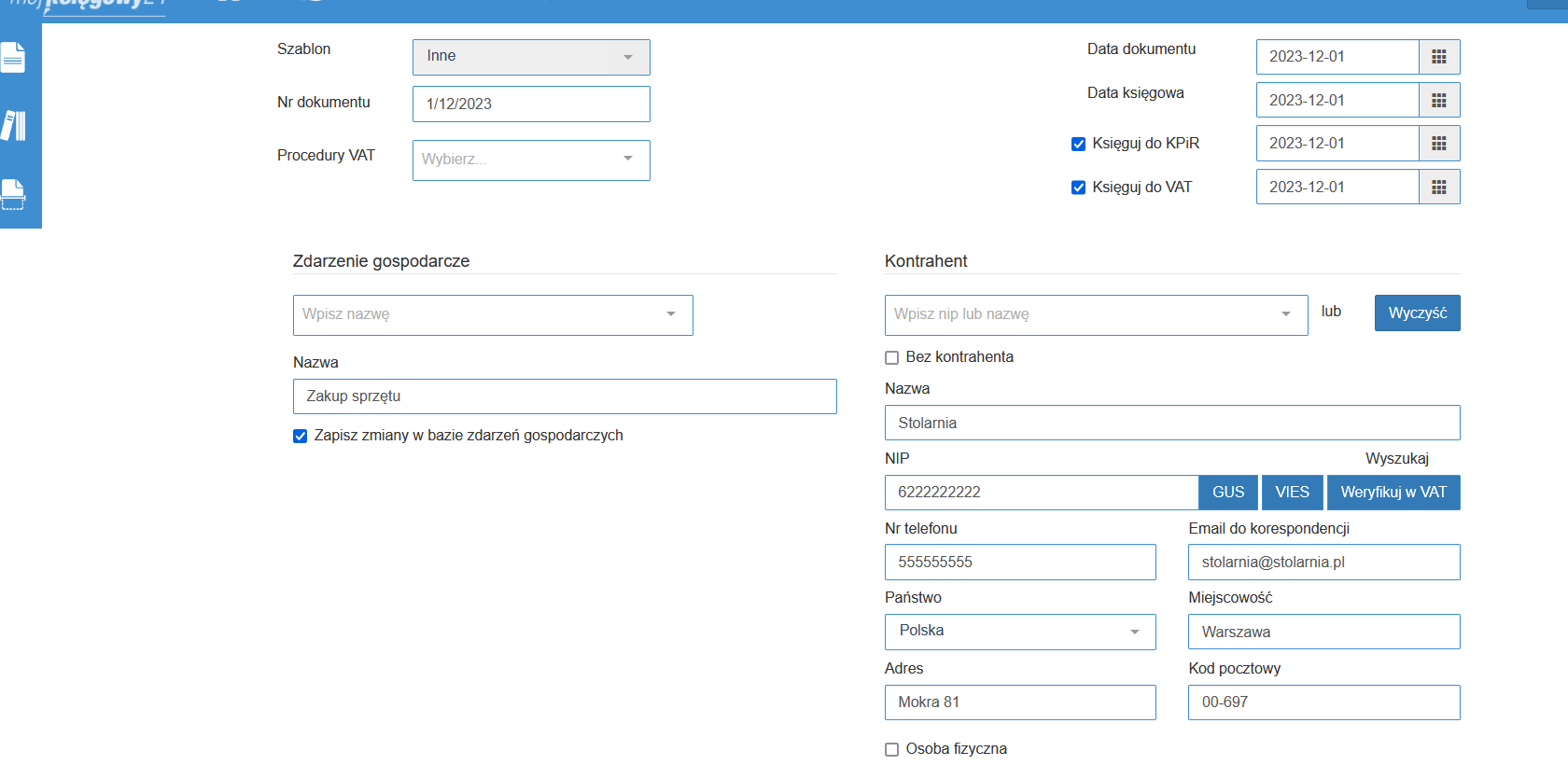 - wybieramy kontrahenta lub dodajemy do słownika wyszukując z gus lub vies