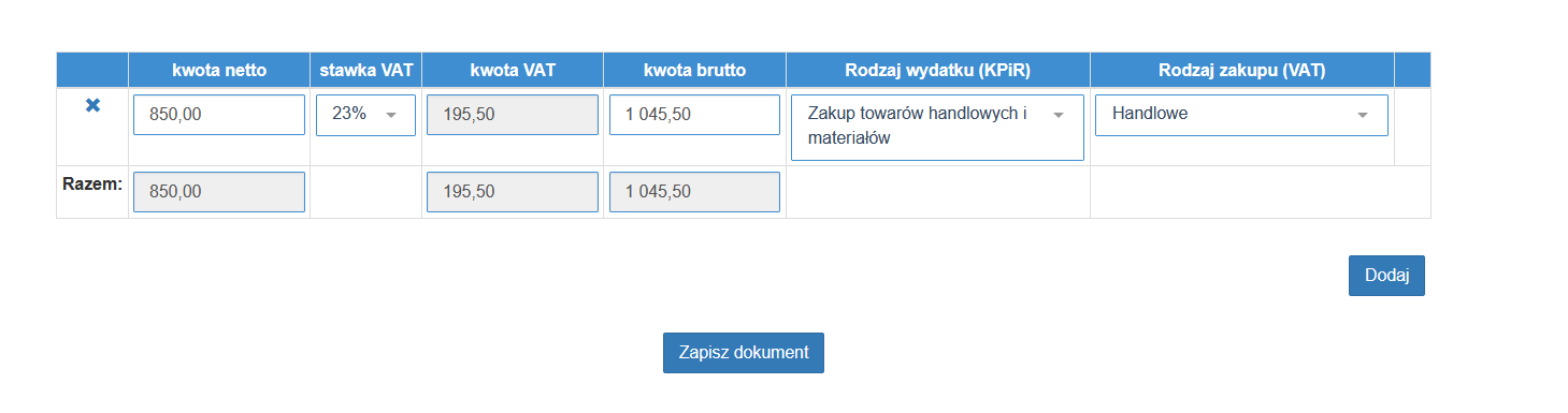 Skorzystaj z przycisku Dodaj aby dodać kolejny wiersz dokumentu, jeśli dodałeś wszystkie pozycje kliknij Zapisz dokument.