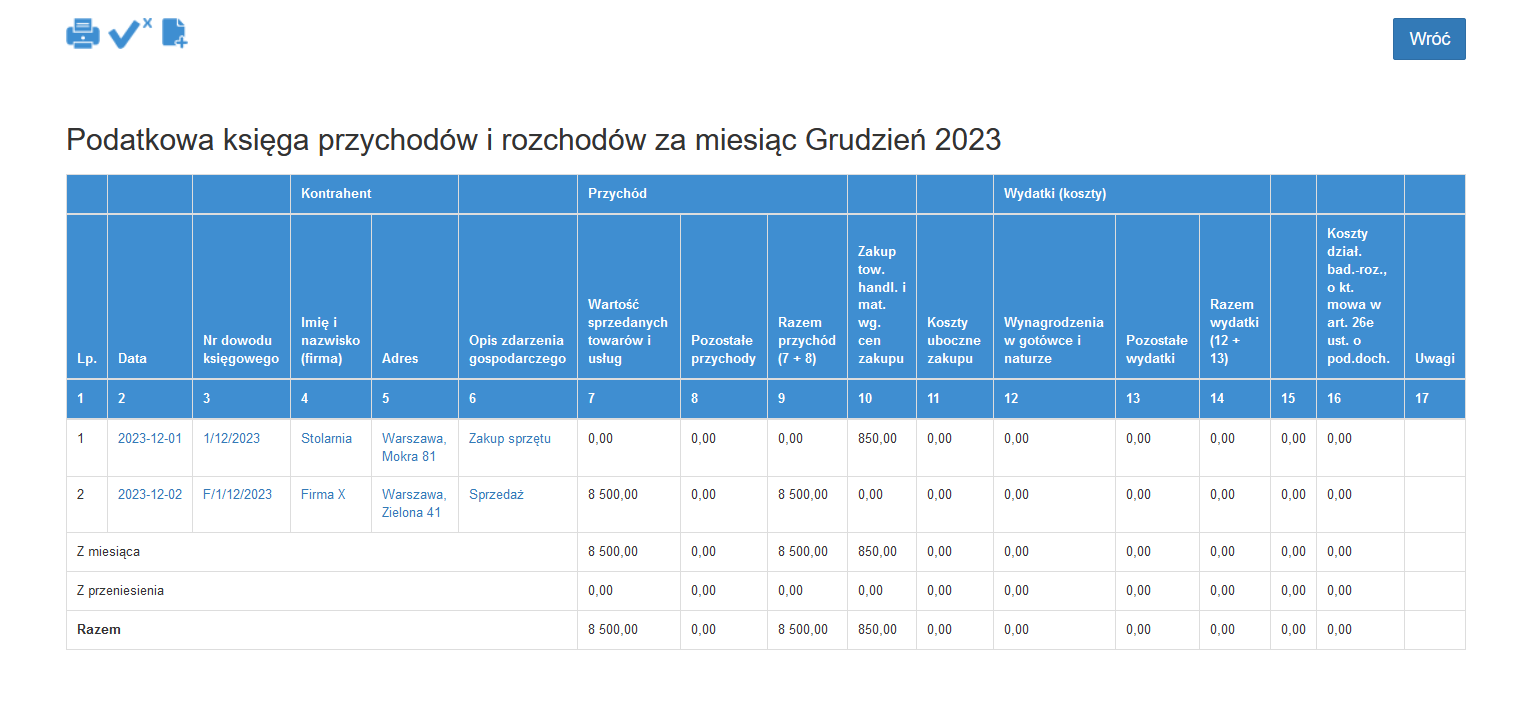 Wprowadzone wpisy zakupu (kosztu) oraz wystawione w Fakturowaniu faktury trafiają do rejestrów KPIR oraz rejestrów vat (sprzedaży i zakupu). Układ podatkowej księgi przychodów i rozchodów przygotowany jest według miesiąca za dany rok i podzielony według kolumn zgodnie z rozporządzeniem Ministerstwa Finansów, również zgodnie z przepisami umieszczone są podsumowania. Aplikacja mójksięgowy24.pl pozwala na wydruk księgi lub zapisanie w .pdf.