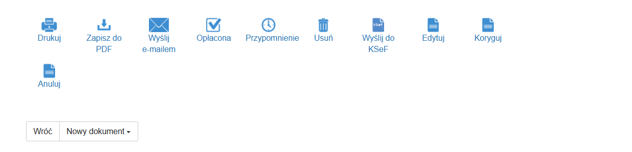 Po dodaniu faktury przejdziesz do widoku z podsumowaniem wystawianego dokumentu (dokonasz tego w dowolnym momencie klikając w numer faktury na liście faktur). Możesz tutaj dokonać edycji dokumentu, wystawić korekty, a także za pomocą górnego panelu ikon: wydrukować, wysłać e-mailem, oznaczyć opłacenie, wysłać przypomnienie, przekazać do KSeF, usunąć lub anulować dokument.