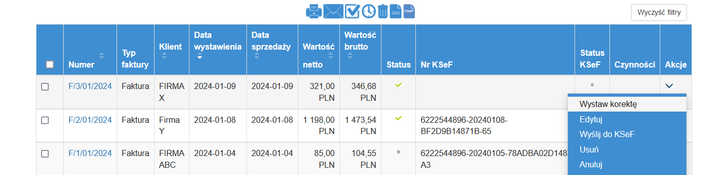 Po przetworzeniu przez KSeF w odpowiedniej kolumnie pojawi się numer KSeF, co potwierdza zarejestrowanie dokumentu w Krajowym Systemie e-Faktur.