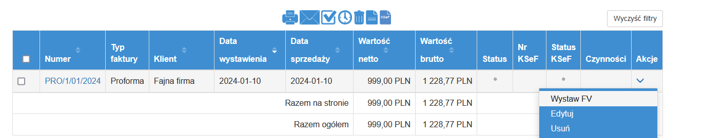 Do wystawionej faktury proforma w prosty sposób możesz wystawić fakturę VAT wybierając na liście faktur z przycisku “akcja” opcję “Wystaw FV”.