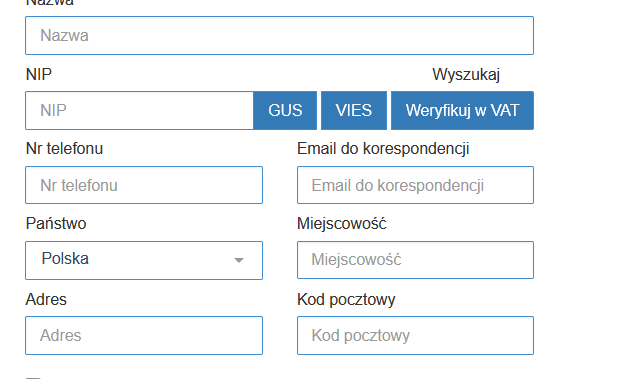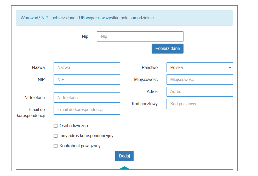 Dane możesz uzupełnić ręcznie lub pobrać wpisując NIP i wybierając przycisk “Pobierz dane”.