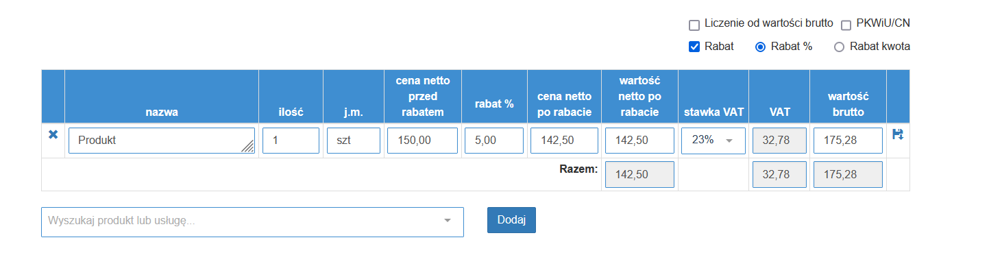 dodaj rabat oraz możesz zmienić sposób liczenia od wartości brutto.
