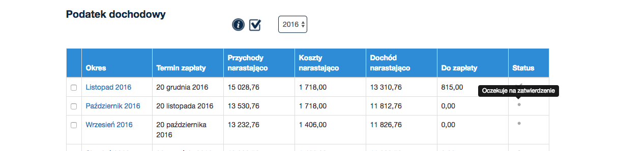 Szary haczyk w kolumnie status w zakładkach podatek dochodowy oraz