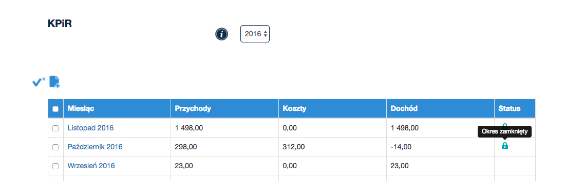 Ikona z kłódką w kolumnie status zakładki KPiR informuje o tym, że biuro rachunkowe zamknęło okres rozliczenia i nie można dokonać już żadnych zmian na dokumentach tego okresu.